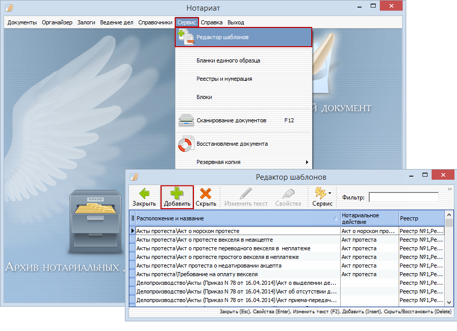 Также создать новый шаблон можно в Редакторе шаблонов, для этого нужно выбрать пункт главного меню Сервис | Редактор шаблонов и нажать Добавить.